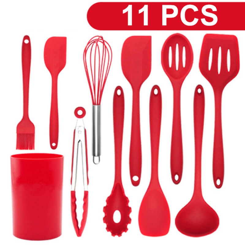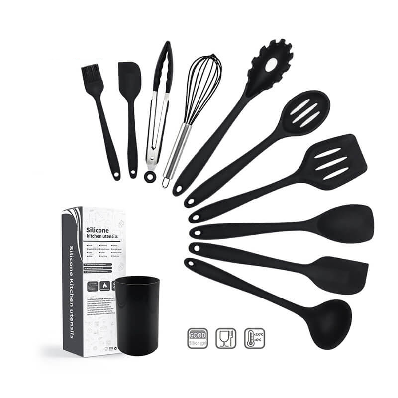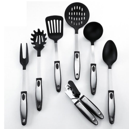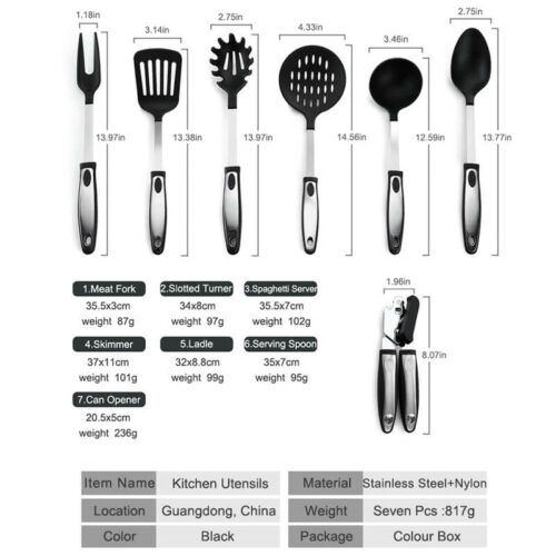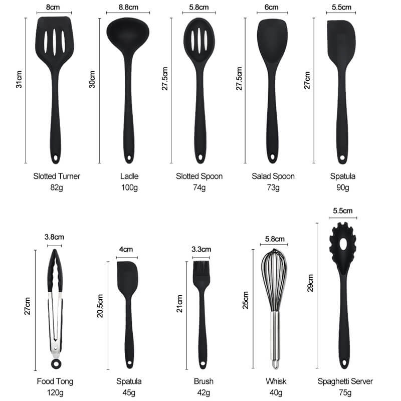Slotted turner: 30.5×8.5cm,91g Ladle: 30×9.5cm,110g Spaghetti Server: 29x6cm,80g Small Spatula: 22x4cm,40g Slotted spoon: 29x6cm,80g Salad spoon: 27×6.5cm,75g Brush: 21.5x4cm,39g Food tong: 28.3×10.3cm,109g Egg whisk:27.5x10cm, 46.5g Holder: 13.6cm Hx 9cm dia,95.2g |